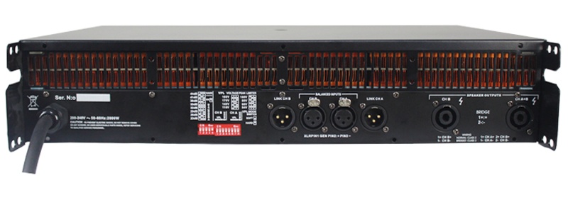 2 x 2,800 Watts into 4 Ohms, 2 x 1,500 Watts into 8 Ohms